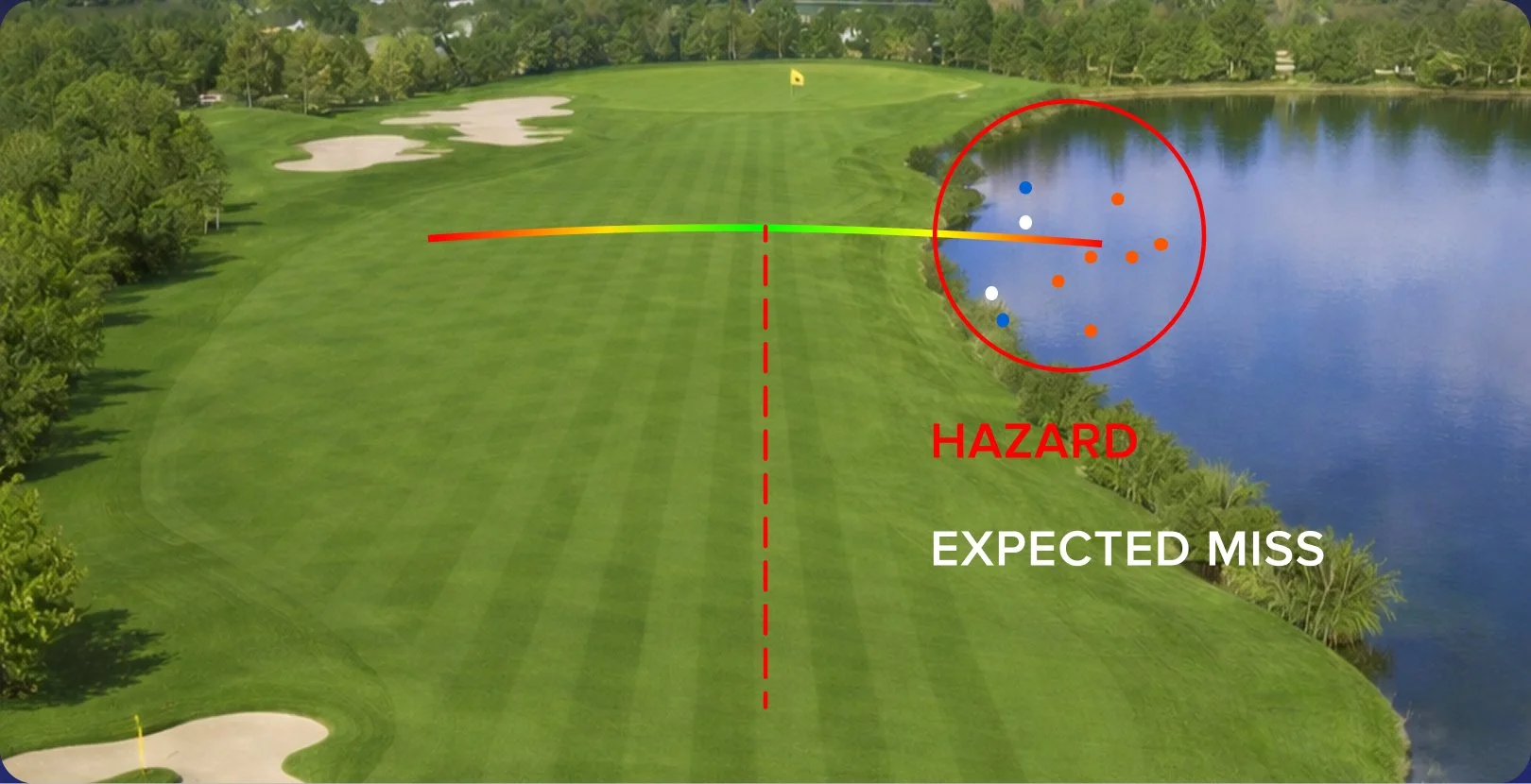 If you aim directly at it, your dispersion shows a portion of your shots leaking into the hazard. The miss isn’t dramatic. It simply sits within your normal pattern. Move the target five yards left. Now your central pattern finishes safely on the green, your common miss is protected and your best shot still gives you a look.